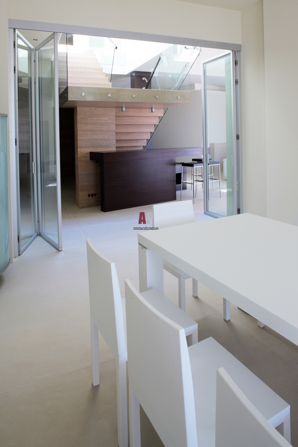 Вид из столовой на лестничный холл и гостиную. Раздвижные перегородки из стекла складываются по принципу ширмы. Авторы проекта Пётр Зайцев и Арсений Борисенко, бюро za bor.