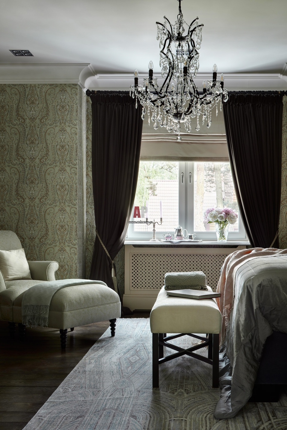 Дом с колониальными мотивами. Интерьер спальни хозяев. Обои, Schumacher, рисунок Isabella Paisley. Шторы, шерсть, Schumacher. Вся обивка мягкой мебели – Schumacher. Люстра, винтаж.