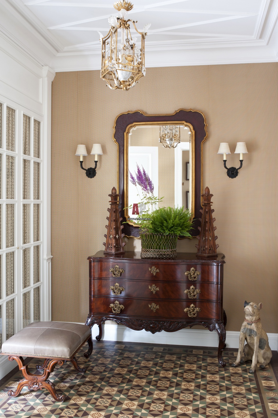 Фото интерьера прихожей в теплых коньячных тонах. На полу – метлахская плитка. Комод, Ralph Lauren. Пуф в кожаной обивке, XIX век, Англия.