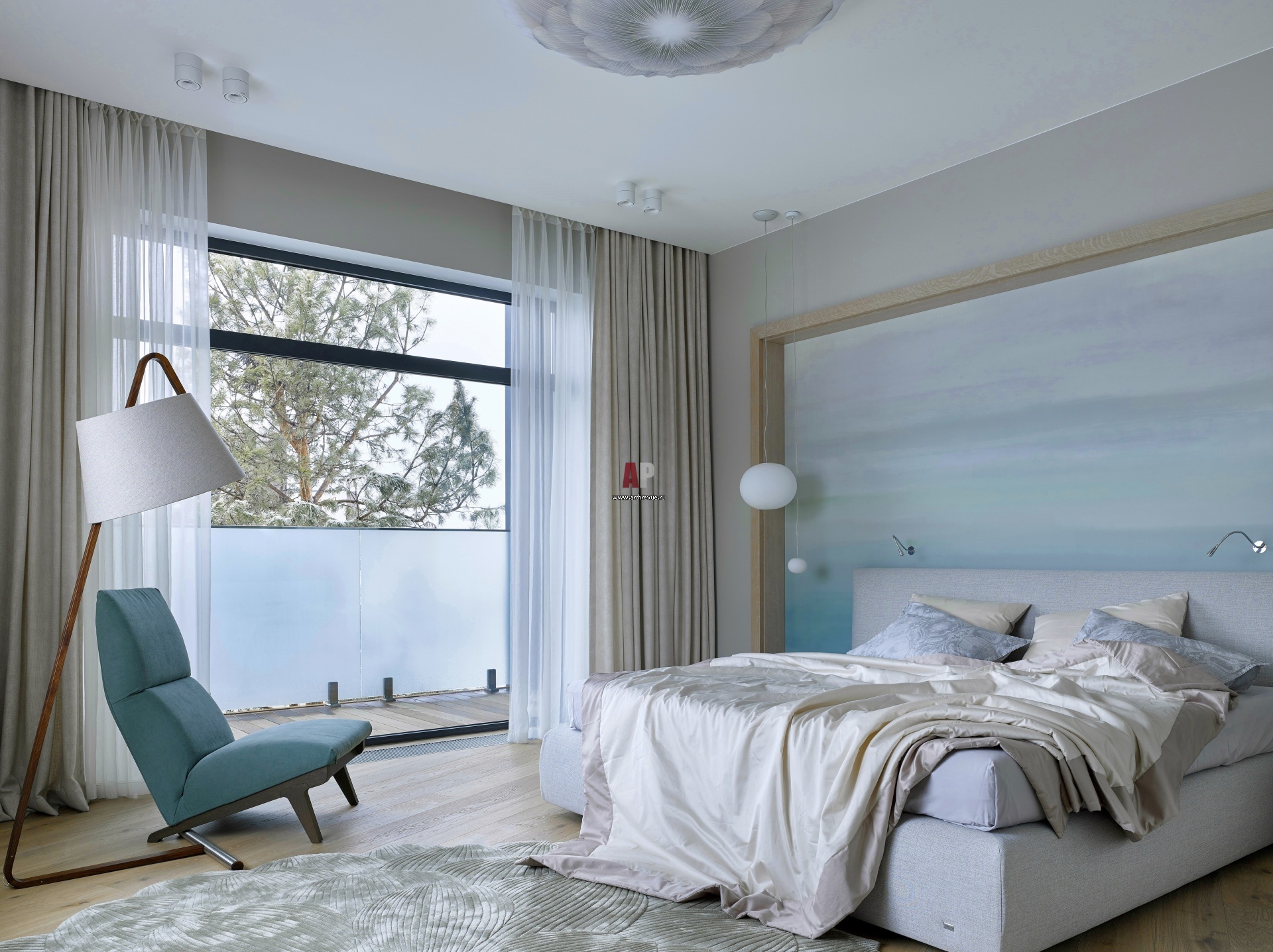 Хозяйская спальня находится на втором этаже, она решена в прохладных жемчужно-голубых оттенках. Стены украшены декоративной абстрактной росписью и деревянными панелями. Кровать, RUF-Betten, модель Primavera. Прикроватные тумбы, Horm, модель Io E Te. Кресло, Former, модель Lisbeth. Потолочный светильник, Horm, модель Numero 3.