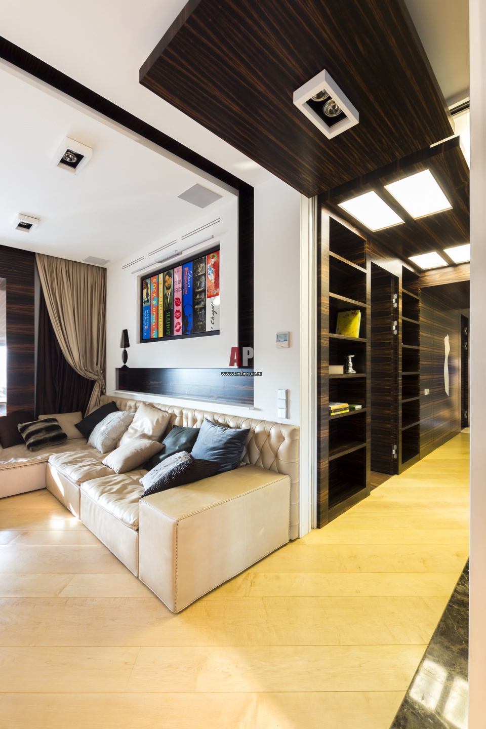 Фото интерьера коридора, ведущего в гостиную. Идущие по потолку коридора воздуховоды закрыты плоскими светильниками, которые видны через выемки в объемной потолочной конструкции из дерева. Светлая массивная половая доска ручной работы уложена по диагонали.