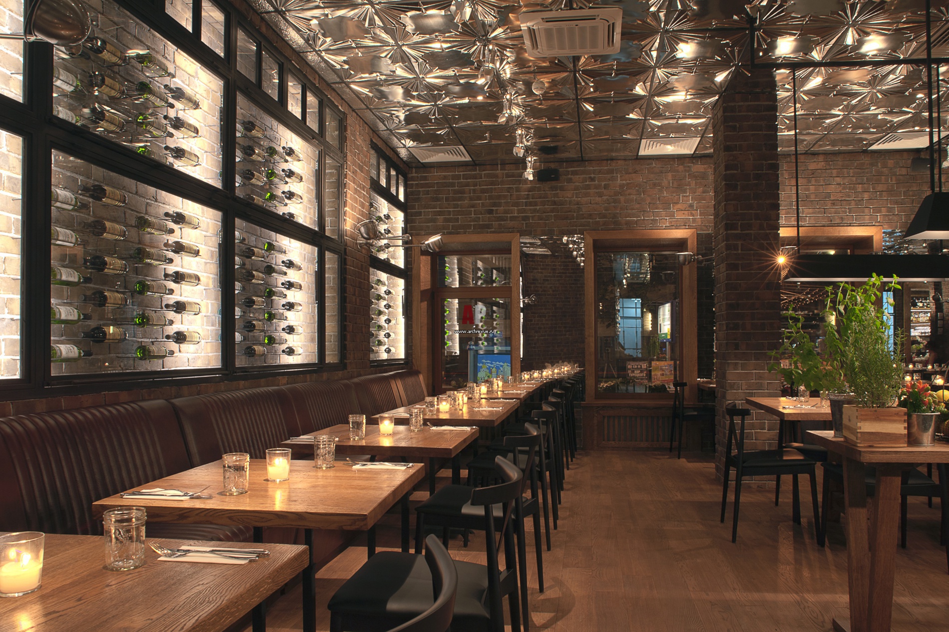 Оригинальная находка авторов – серебристые потолки Armstrong, которые они привезли из Америки. Фольгированные панели работают как зеркала и выглядят необычайно эффектно.