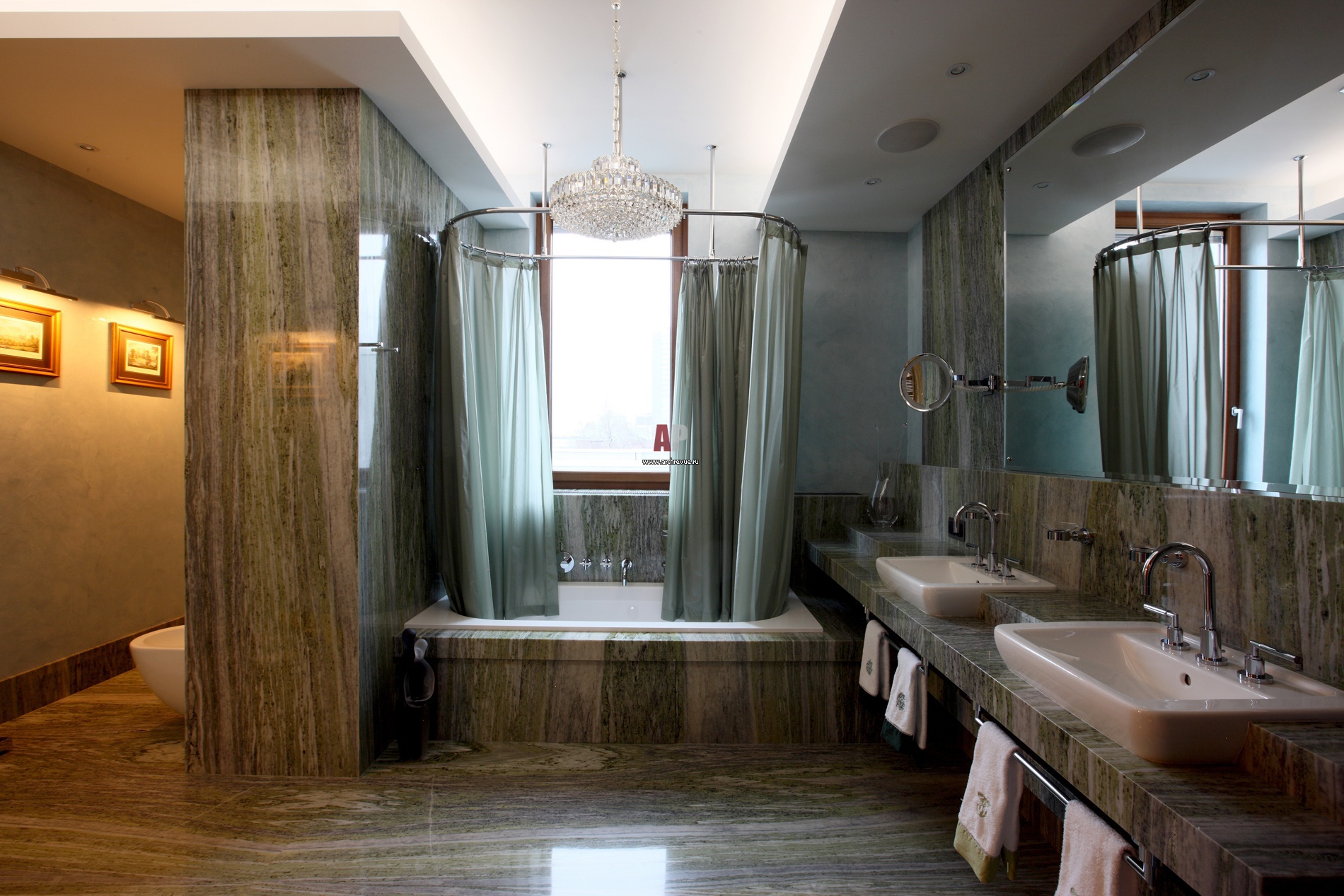 Главная ванная комната состоит из двух зон: небольшой скрытой интимной части с унитазом и биде и просторной зоны с умывальником и ванной. Главная идея оформления интерьера – образ водопада. Эффект стекающей воды создают удачно подобранные слэбы мрамора. Сантехника, Villeroy & Boch.