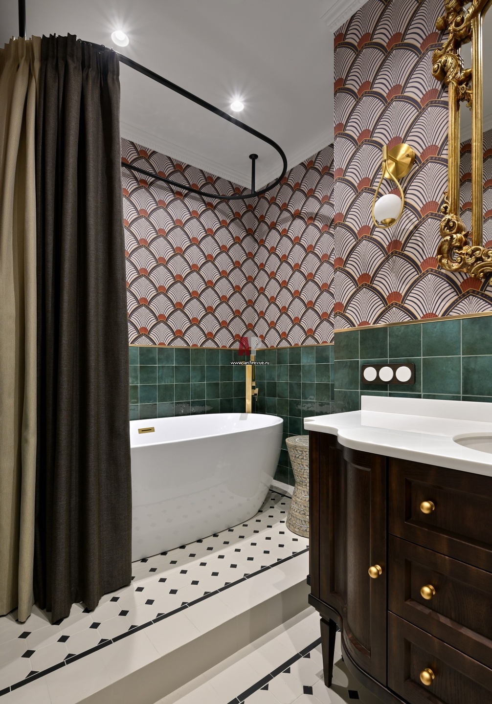 Небольшая семейная квартира с французским шармом. Интерьер ванной комнаты. Ванна овальной формы установлена на подиуме и украшена контрастной темной шторой на металлическом карнизе.