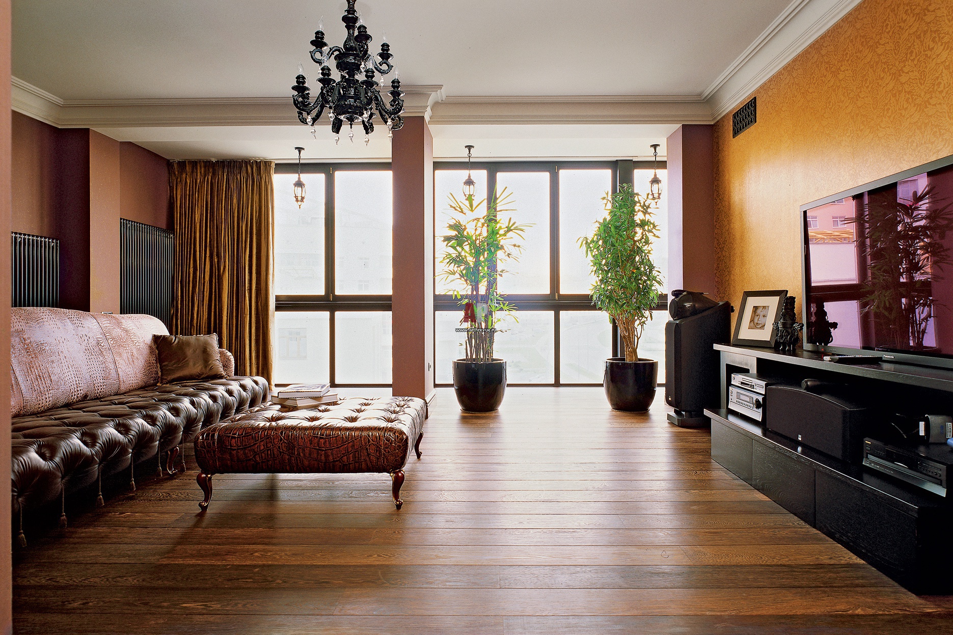 Кожаная мебель Marie's Corner, поставщик «Креасьоне Привато», особенно выигрышно смотрится на фоне широкой половой доски из венге Farecom, поставщик «Мир Паркета».