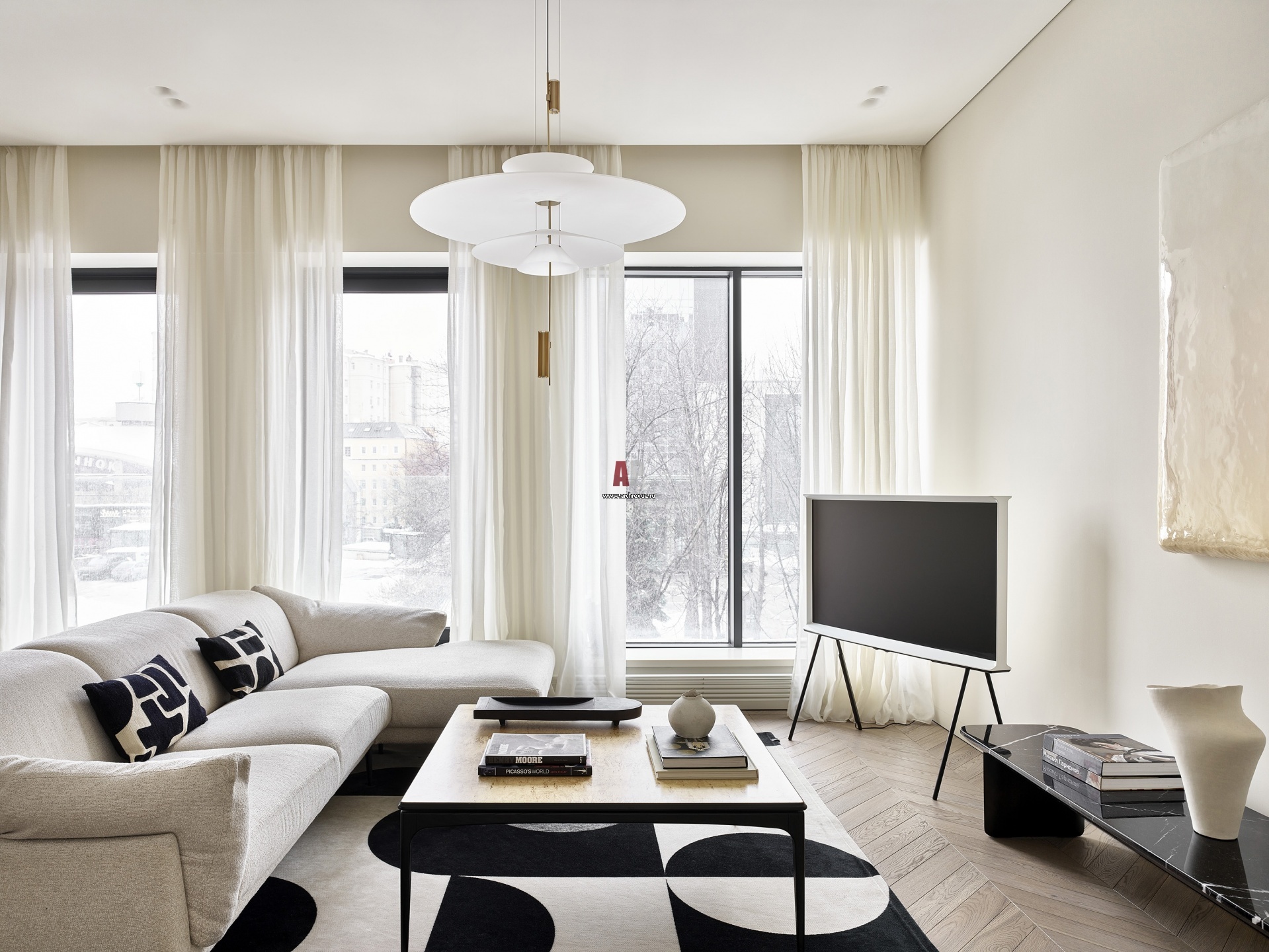 Гостиная. Диван, Calia Italia. Журнальный столик, Unika Møblär. Приставной столик, Hay. Подвесные светильники, Vibia. Все стены выкрашены в один светлый оттенок, краска Benjamin Moore & Со, Aura, тон 970.