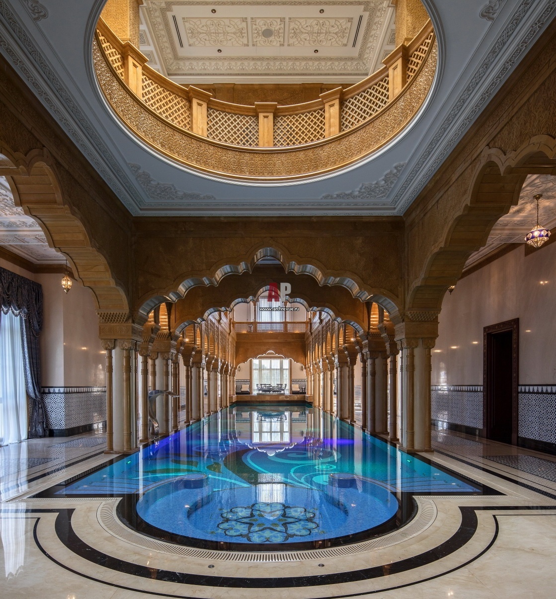 Эклектичная резиденция на Ближнем Востоке с элементами европейской классики и восточными традициями. Бассейн со вторым светом.