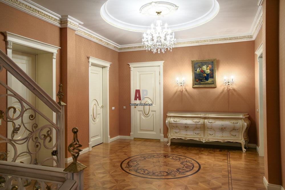 Оформляя холлы дома, автор использует более сочные оттенки обоев на стенах, поставщик «Стрингер». Паркетные полы украшены художественными элементами, художественный паркет «Ковчег-паркет»