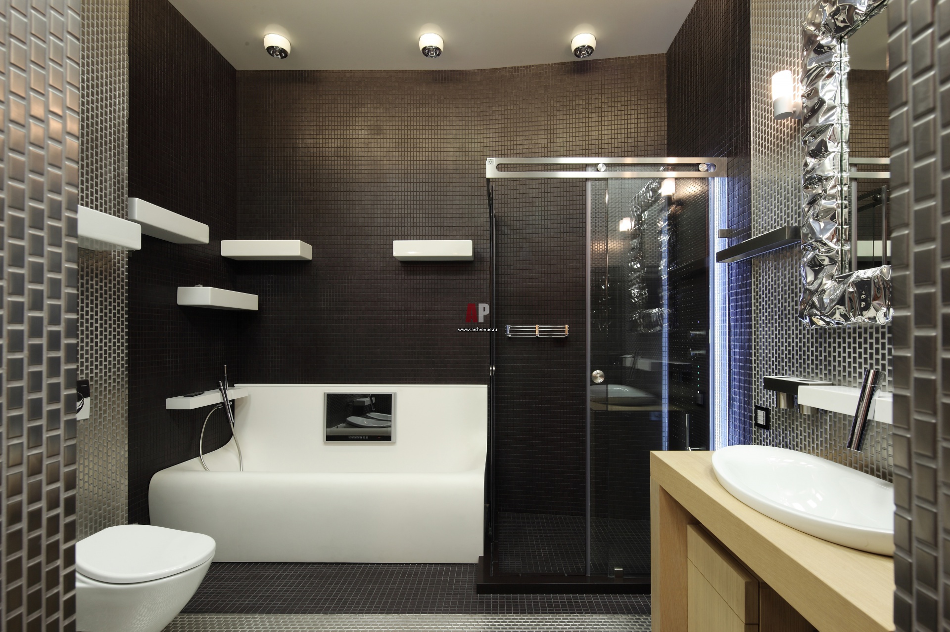 Интерьер ванной комнаты в стиле футуризм при главной спальне. В оснащении использована сантехника из дизайнерских коллекций с электронным управлением.
