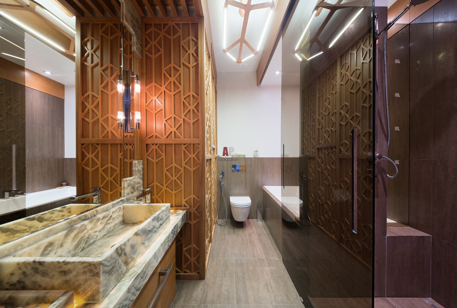 Интерьер ванной комнаты с отделкой из оникса. Прозрачный витраж из медного тонированного в массе стекла разделяет душевую зону и ванну. В помещение выведены аудиоколонки и локальное управление сервером (можно слушать отдельную от всей квартиры музыку, звук с телеканала или тот же звук что и в гостиной; есть режим при котором слышен дверной звонок, доступна функция мультирум для диалога с находящимся на кухне или гостиной прямо из ванной).