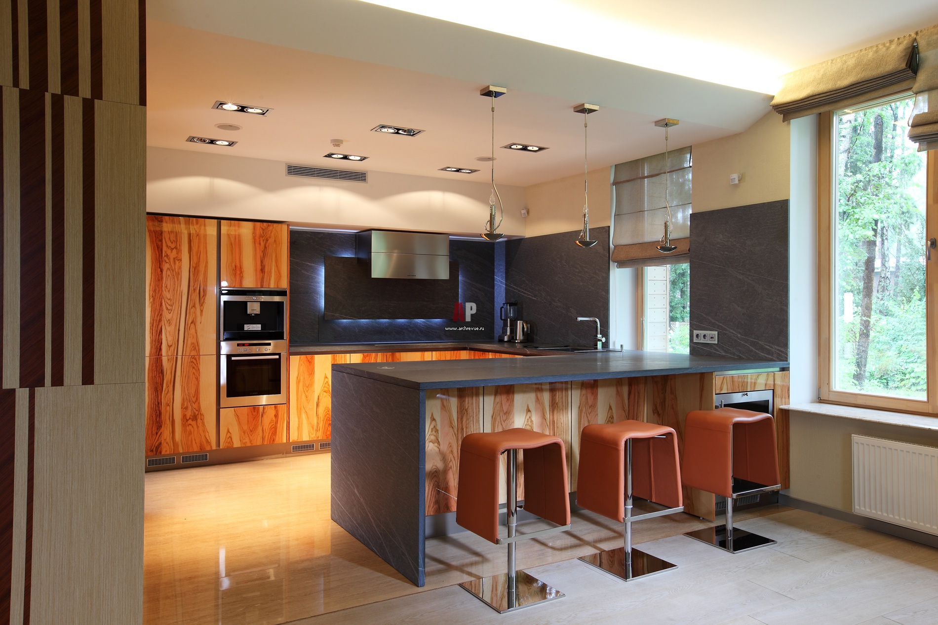 Кухня сделана частью общего пространства первого этажа. Кухонный гарнитур Toncelli отделан панелями из древесины оливы.