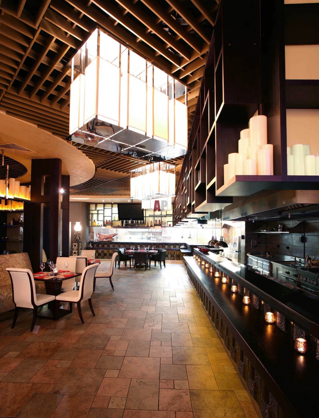 Стойка открытой кухни с 12-иметровым угловым раздаточным столом зашита деревянными панелями с чеканными вставками. Онb набраны из китайских ширм. На полу – терракотовая плитка разного размера, поставщик BARS RED.