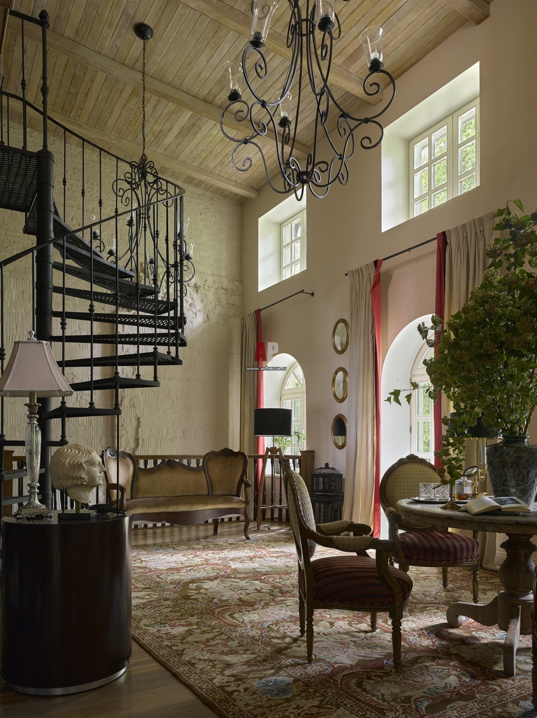 Аристократическую линию оформления поддерживает декор второго этажа, двусветный зал больше всего напоминает гостиную старого французского замка с деревянным потолком. Кирпич здесь аутентичный, с утолщениями и шероховатостями, он был лишь окрашен в светлый оттенок и выставлен на обзор.