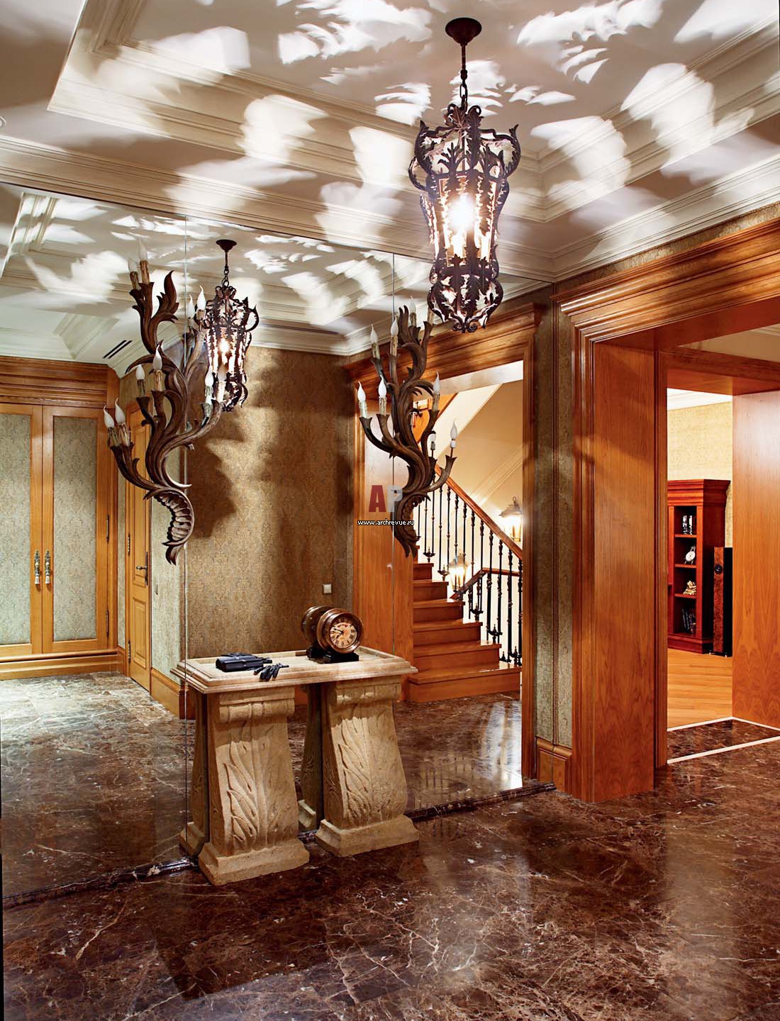 Перепланировка лестничного проема позволила увеличить холл. Прихожая оптически увеличена благодаря огромному зеркалу, отражающему антикварную консоль из белого мрамора. Пол выложен мрамором имперадор. Здесь же размещена система встроенных шкафов.
