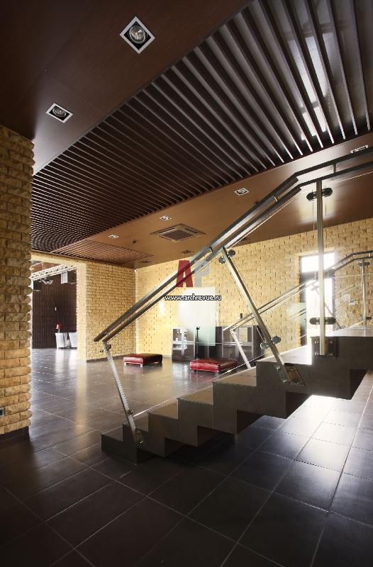 Павильон, названный «Изба-гуляльня», представляет собой строение с 250-ти метровым пространством для отдыха, а так же двухэтажный объем, где разместились кухня, помещения для обслуживающего персонала, спальни для гостей и просторный гараж. Их связала лестница, ограждение лестницы изготовила компания State-art.