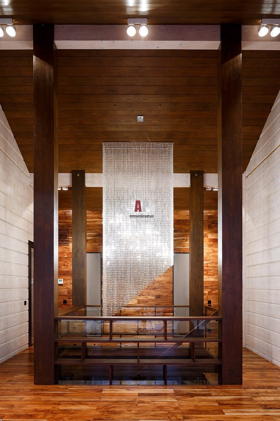 Лестничный холл оформлен древесиной сукупиры с рельефом, который играет на свету. Роскоши добавляют хрустальные люстры, изготовленные в Италии компанией Or Illuminazione по чертежам архитекторов.