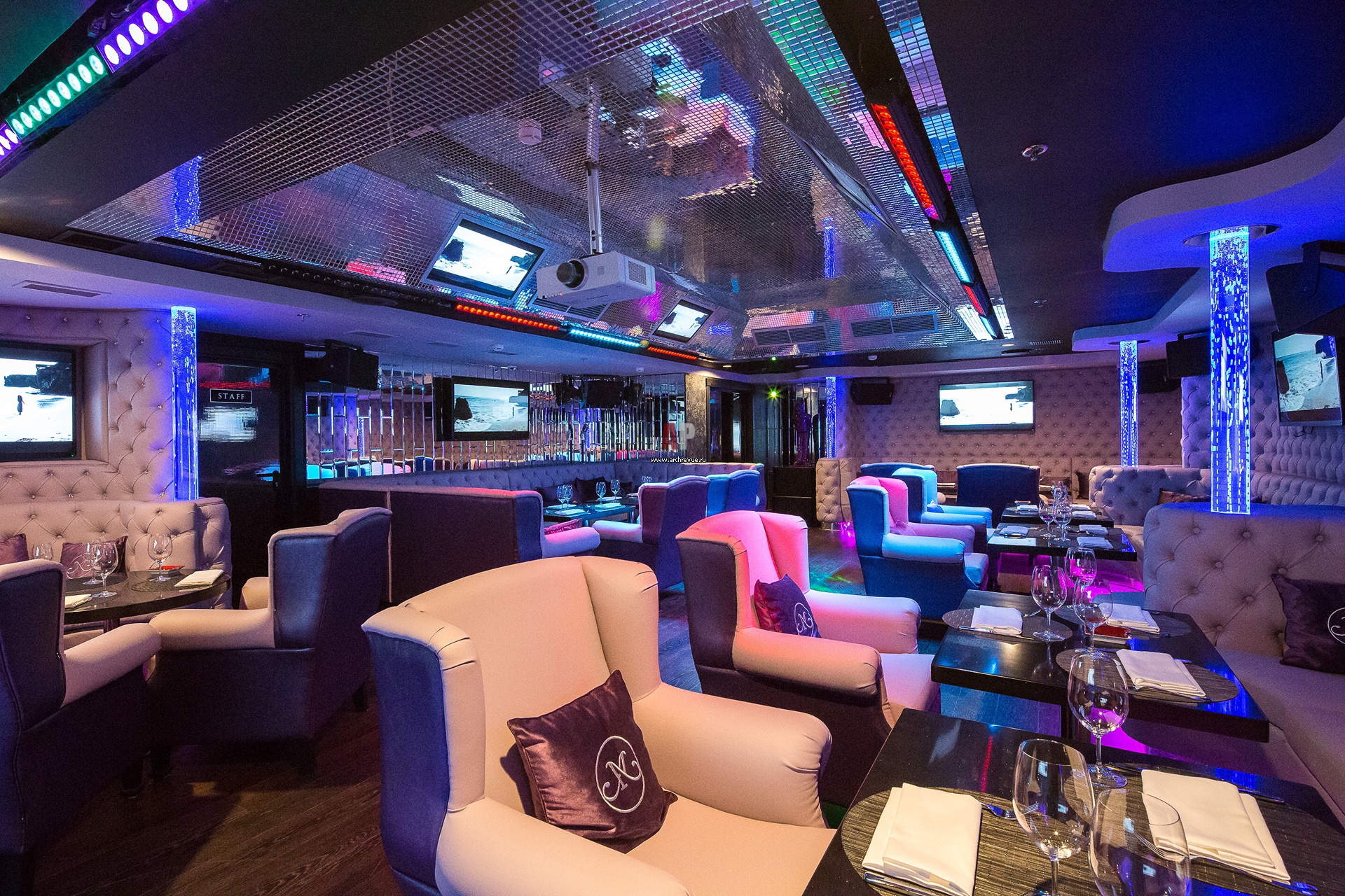 Дизайн караоке-зала в интерьере ресторанного комплекса. Многоуровневый потолок облицован зеркальной мозаикой. Стены зашиты кожаными панелями.