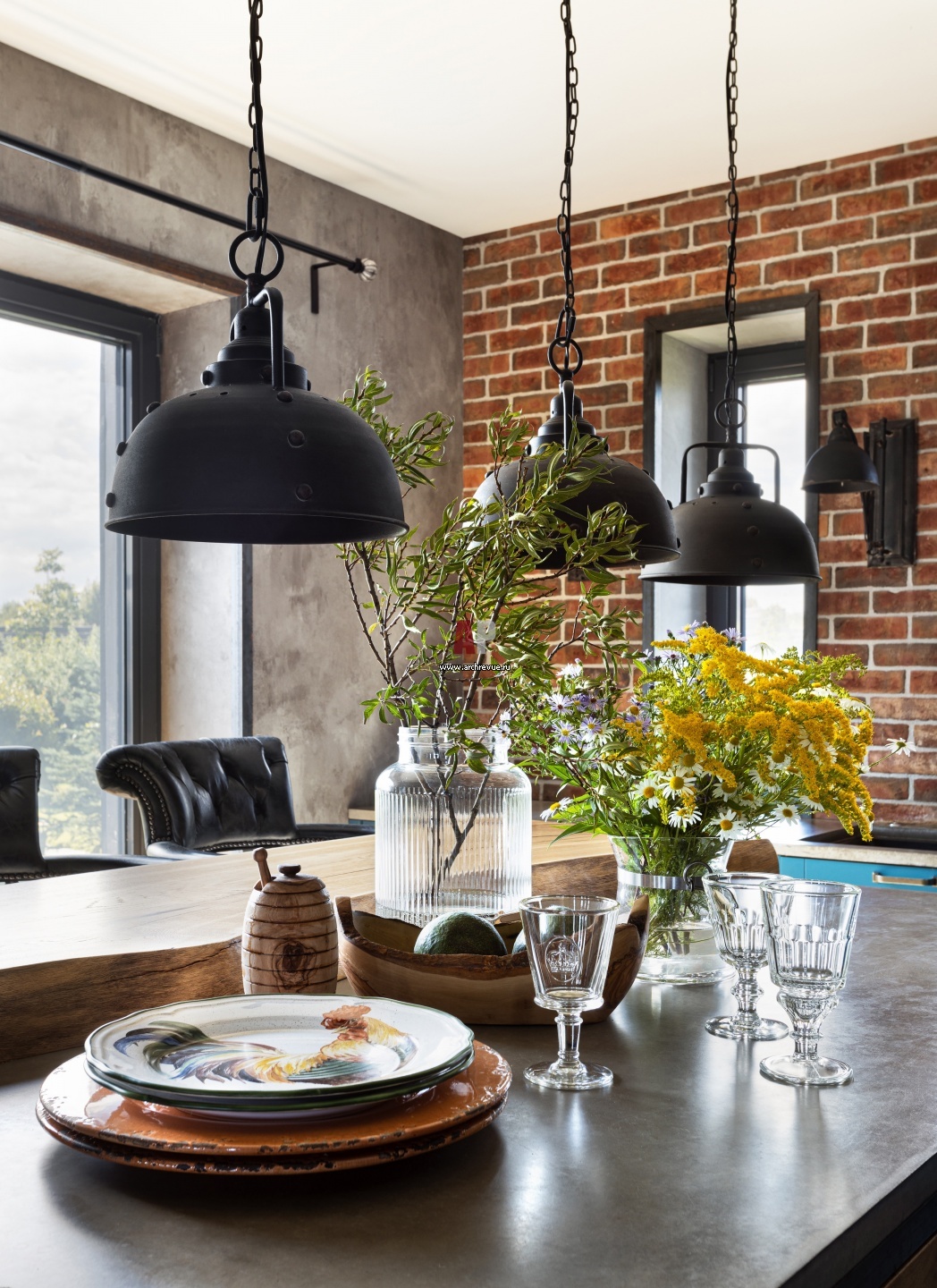 Остров кухни. Тарелки с петухами были заказаны в мастерской Флеры Даминовой в подарок на новоселье хозяйке дома.