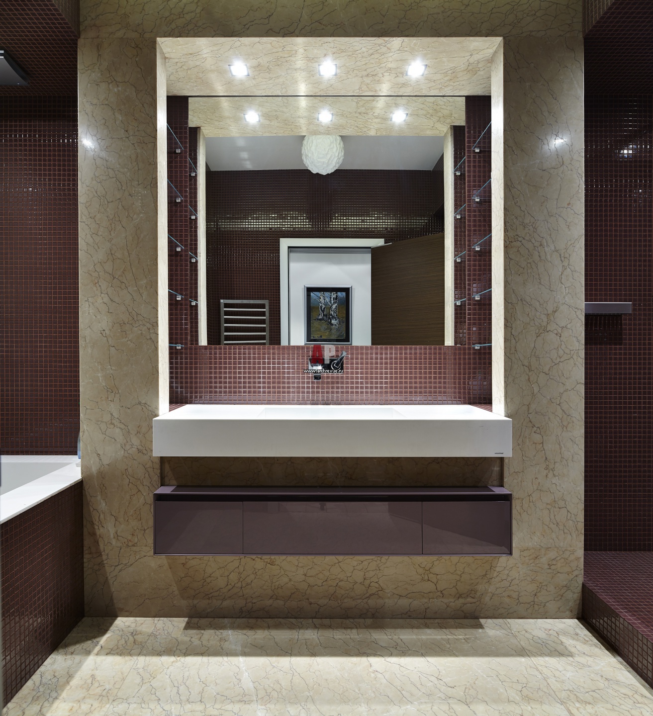 Фото интерьера санузла в шоколадной гамме. Полы и стена за умывальником отделана керамогранитом под мрамор. Зеркало, душевая кабина и зона ванны выделена мозаикой темно-коричневого цвета. Плитка, мозаика, поставщик BARS RED.