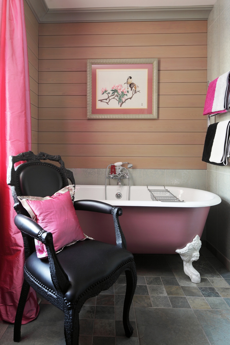 Ванная комната хозяев. Стены зашиты деревянными панелями натурального цвета. Чугунная ванна на изогнутых ножках, Jacob Delafon. Ее внешняя часть выкрашена в серо-розовый цвет, как и шторы. Кресло, MOOOI.