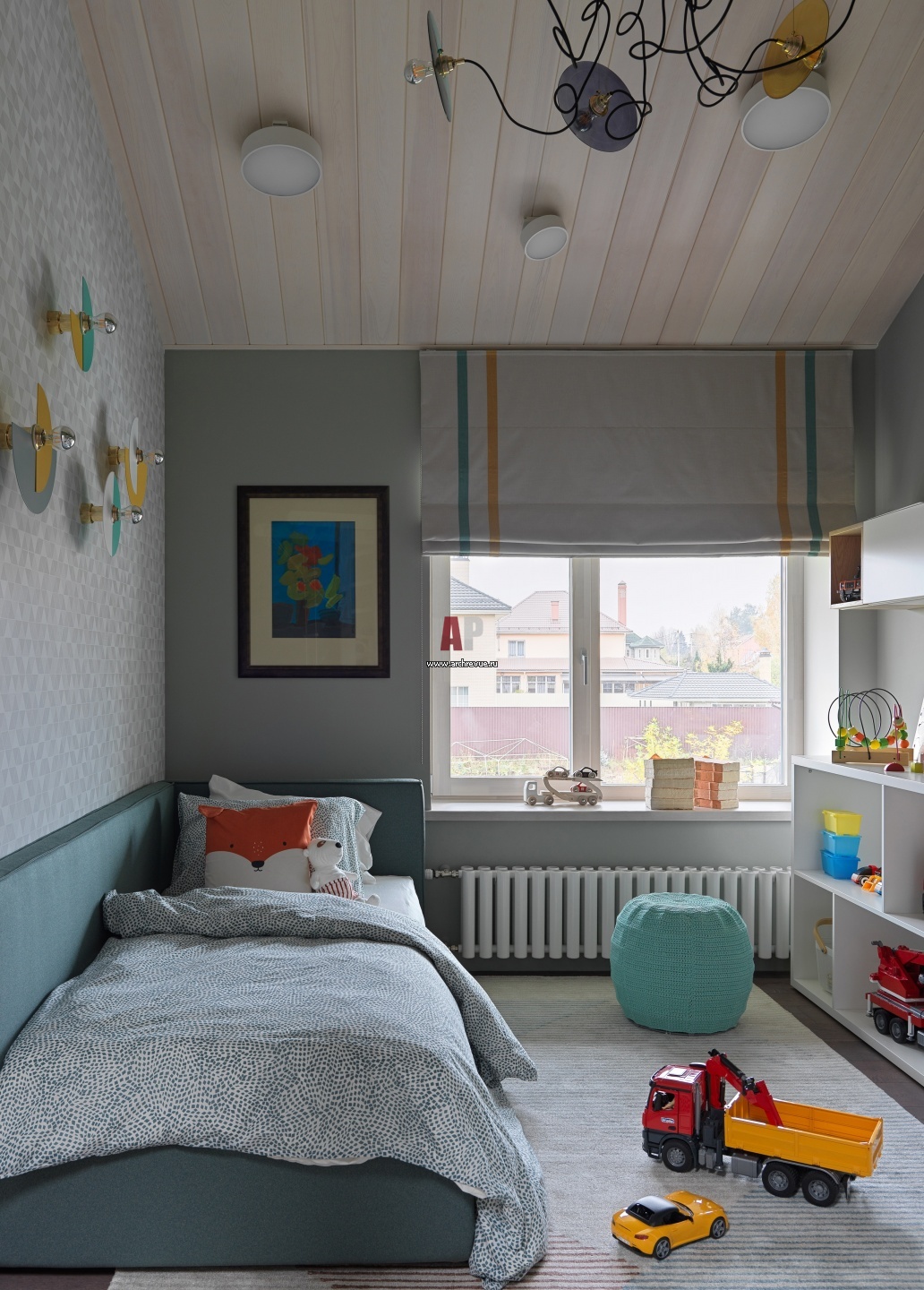 Комната младшего сына. Палитра помещения спокойная, акцент сделан на оригинальные светильники, Aromas del Campo. Напротив кровати – открытый стеллаж для игрушек, до которого удобно добраться малышу.