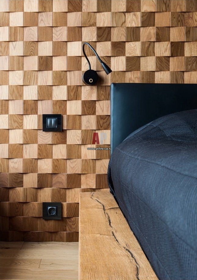 Стена за изголовьем кровати отделана деревянной мозаикой с 3D -эффектом.