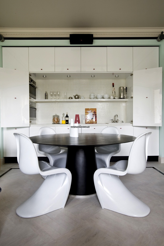Кухня со складными дверями сделана по эскизу архитектора из панелей «Икеа». Бытовая техника встроена в торцевые части шкафа. При закрытых дверях не видно ни технику, ни мойку, ни варочную панель, ни кастрюли со сковородками.