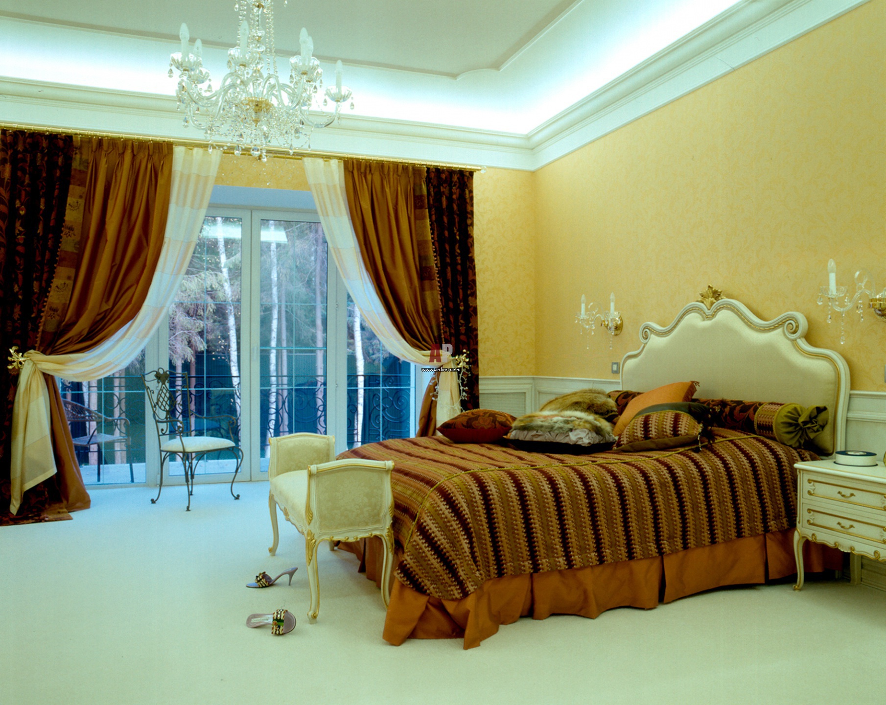 Хозяйская спальня в классике оформлена в светлых тонах. Стеновые панели, Bucalossi. Люстра, Italamp.
