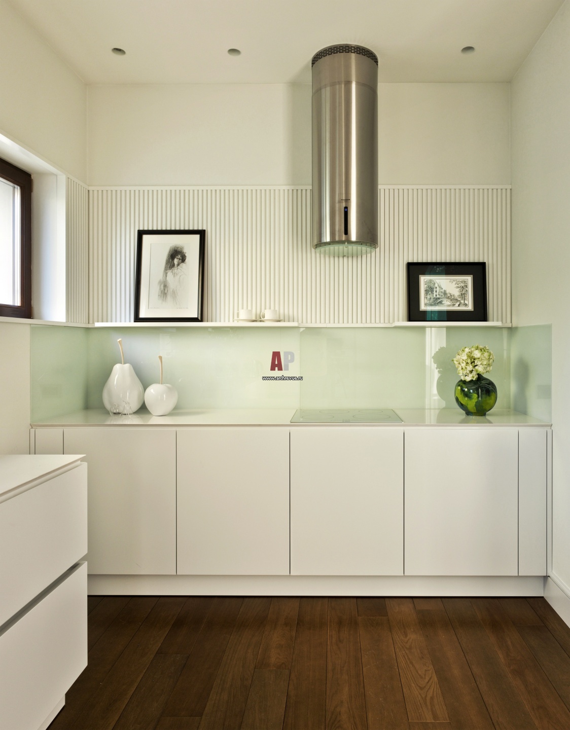 Изолированная кухня имеет небольшую площадь. Белый лакированный кухонный гарнитур, Eggersmann.