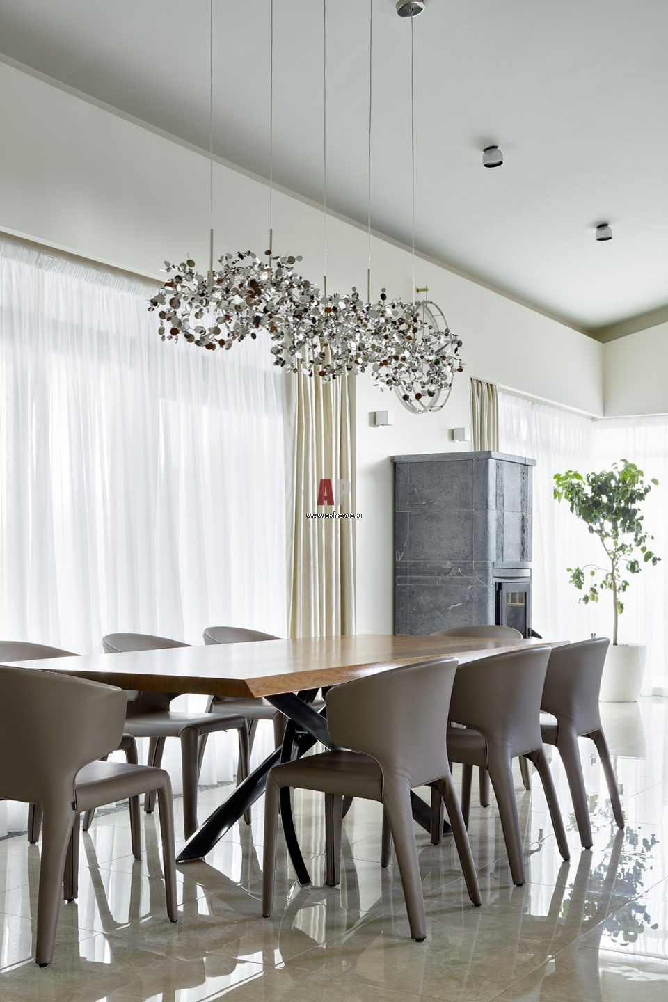 Столовая группа в общей гостиной. Стол, Bonaldo. Кожаные стулья, Cassina. Потолочный светильник, Terzani.