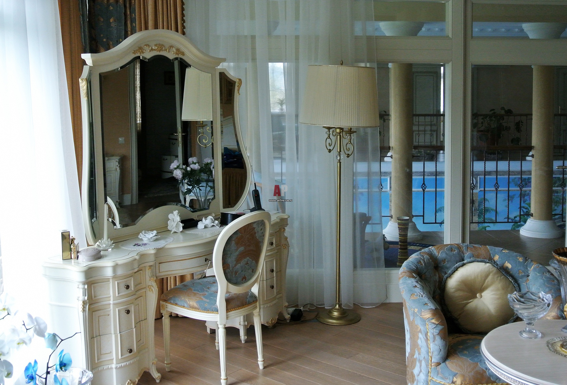 Дизайн неоклассической спальни с туалетным столиком. За витражным стеклом выход на верхний уровень помещения бассейна.