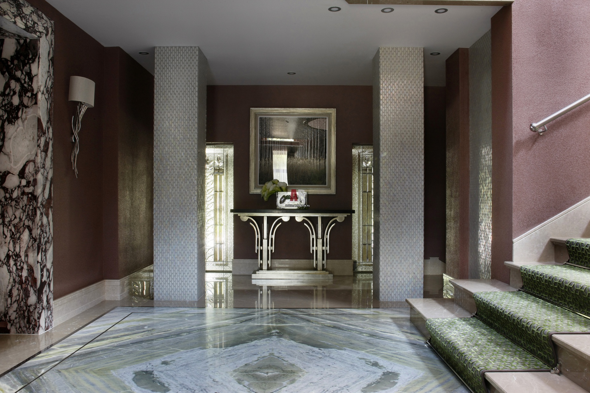 Центральный холл первого этажа. Для отделки полов выбрана комбинация бежевого и зеленого мрамора. Стены оформлены декоративной штукатуркой с перламутром, колонны украшены перламутровой мозаикой в виде лепестков.