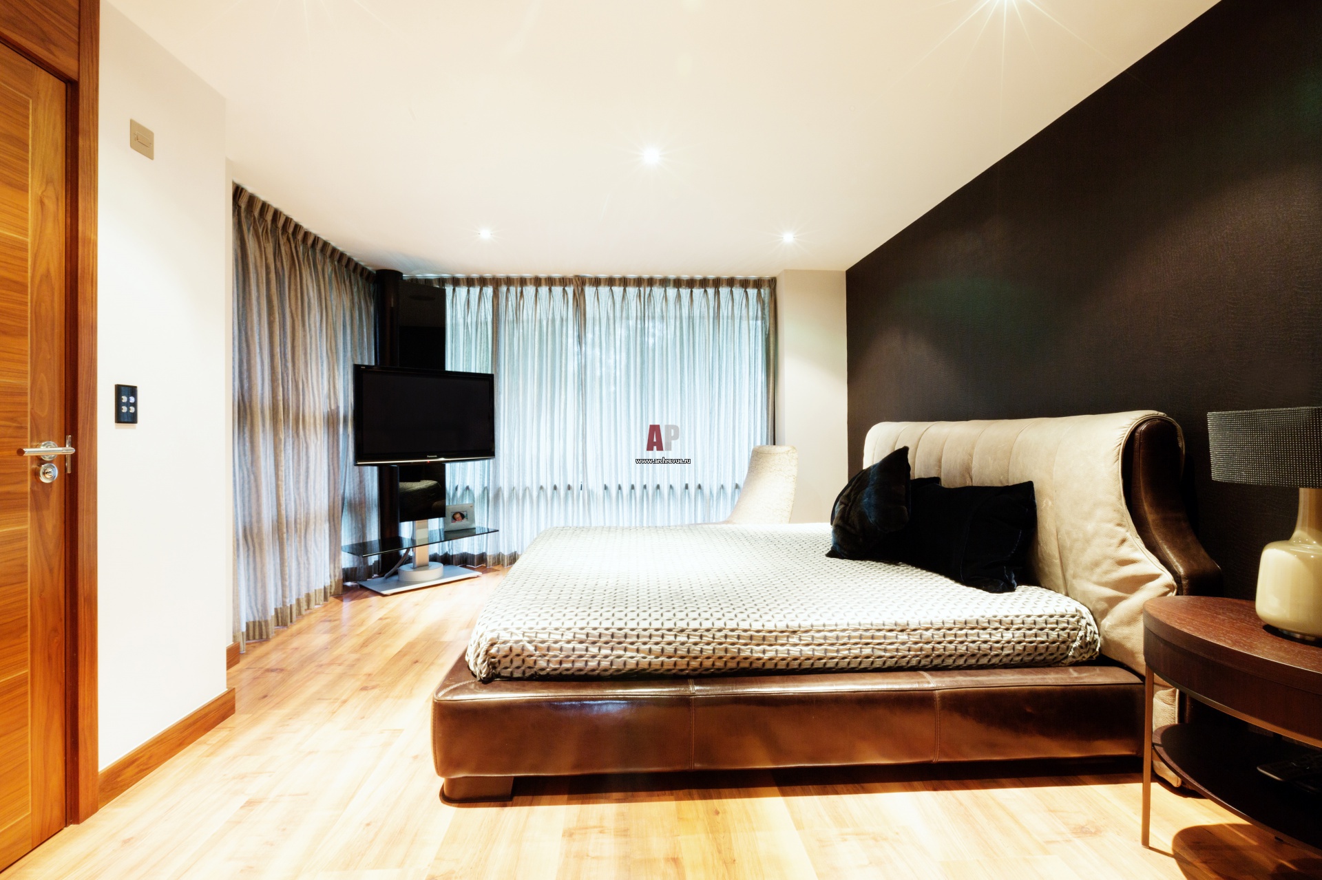 Фото интерьера спальни в сдержанном мужском стиле. Кровать, Baxter. Стена за кроватью зашита кожаными панелями.
