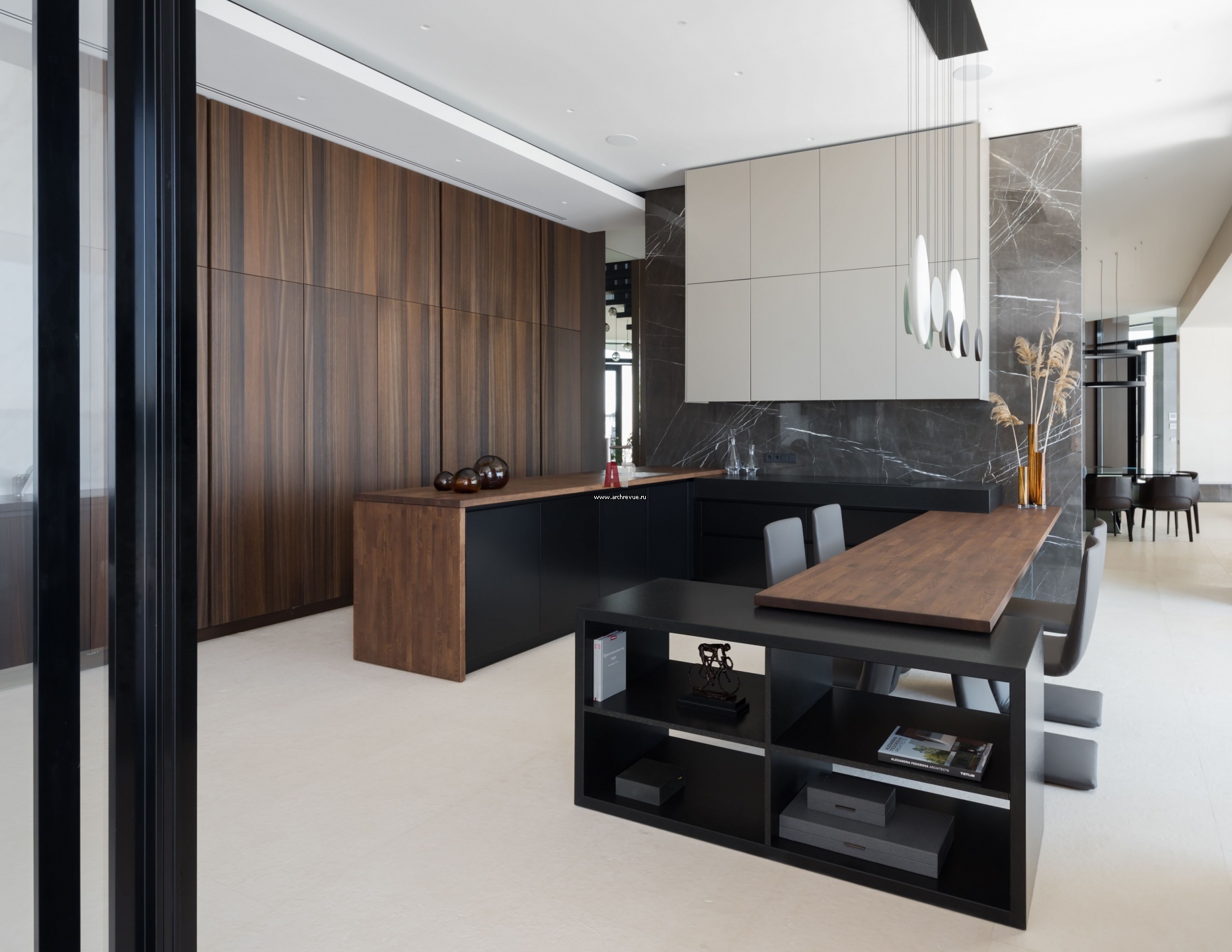 Лаконичные формы кухни Eggersmann подчеркивают роскошные отделки экзотическим деревом. На полу – крупноформатный светлый известняк. За раздвижными стеклянными перегородками находится крытая веранда с выходом на улицу.
