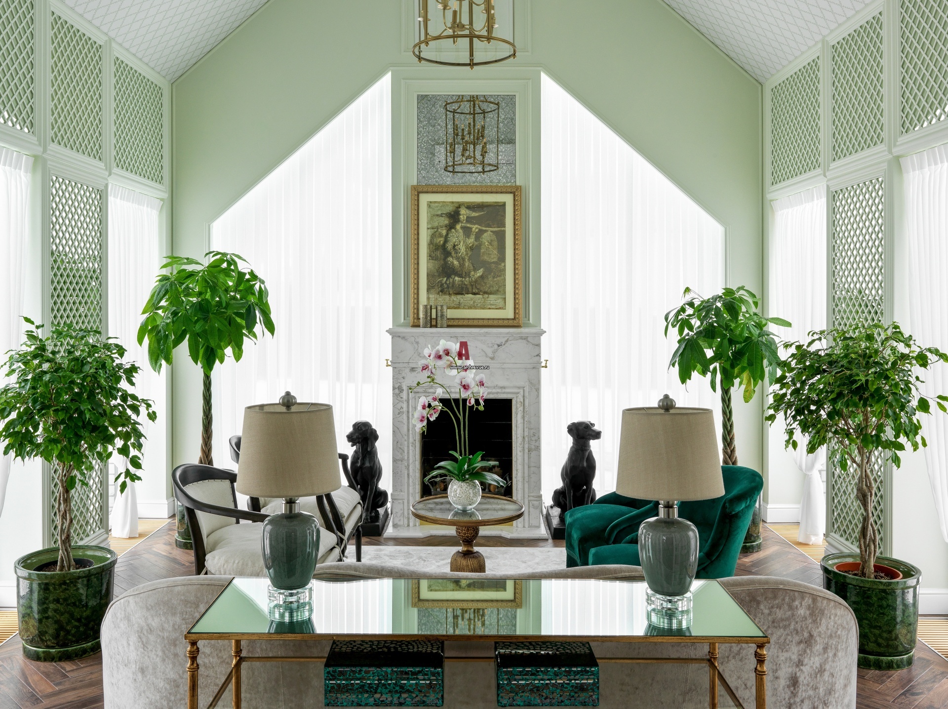 Зимний-сад оранжерея с камином выполнен в изумрудно-фисташковой цветовой гамме. Консоль, светильники, Uttermost. Кресла и столик, Eichholtz. Диван, на заказ. Камин облицован серым мрамором.