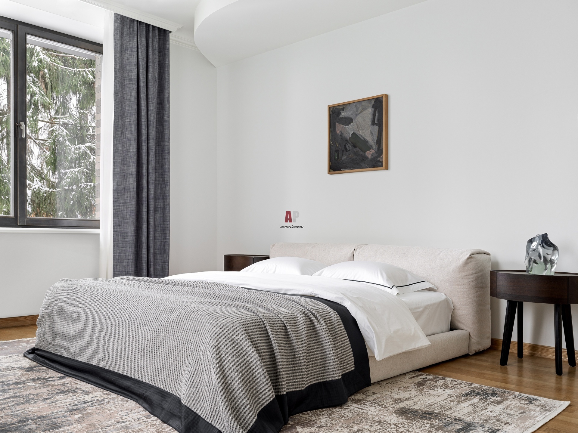 Светлый и воздушный дом в стиле современная классика. Гостевая спальня на втором этаже. Кровать, Boca Room. Прикроватные тумбы, Poliform. Картина Ивана Глазкова.