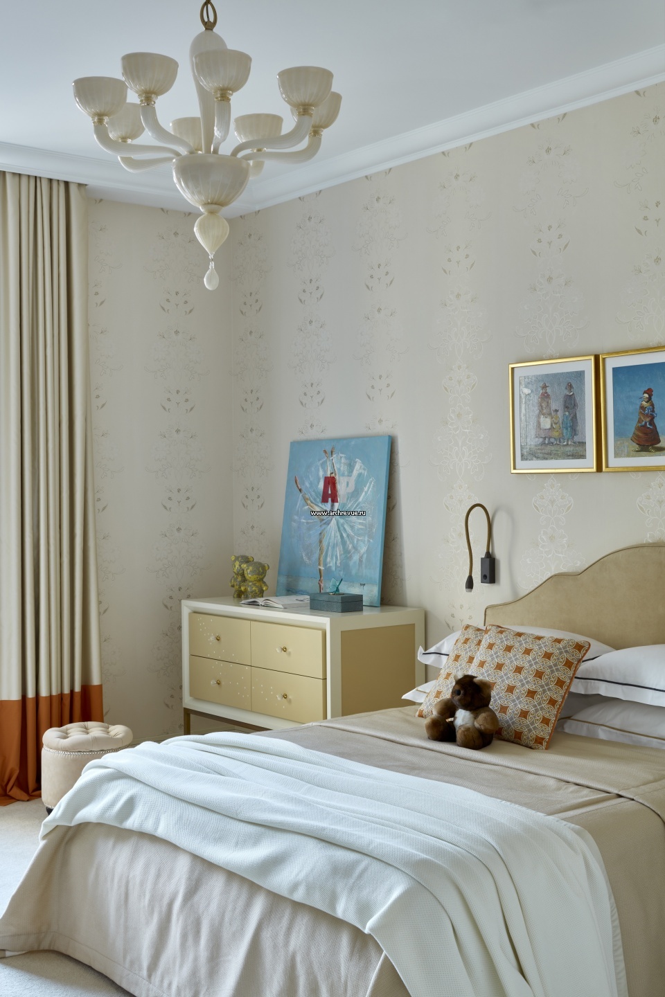 Современная квартира с элементами ар-деко для семьи с двумя детьми. Детская спальня. Кровать, Piermaria. Люстра, La Murrina. Комод с ручками из горного хрусталя, на заказ.