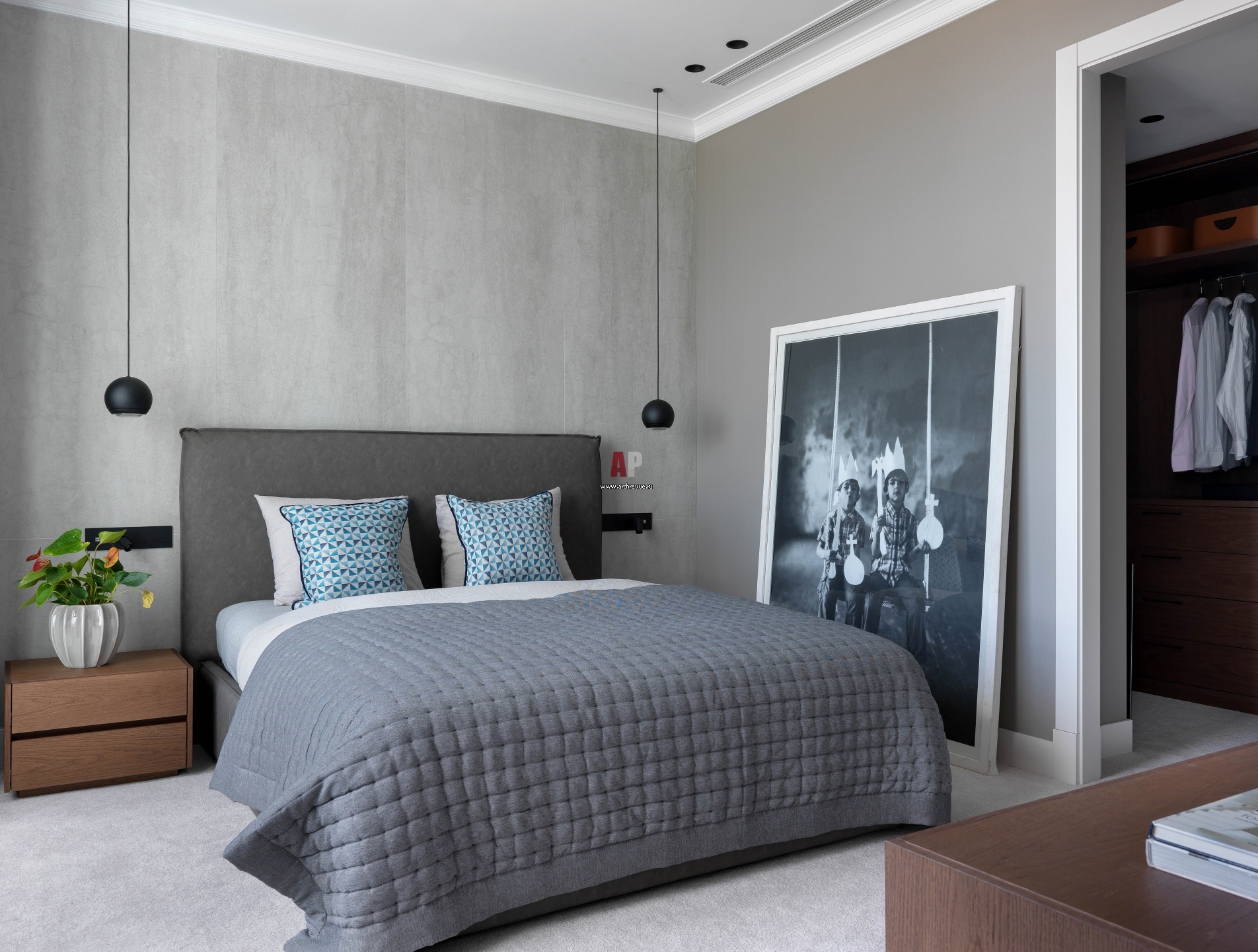 Квартира для студента. Интерьер спальни. Стена за изголовьем кровати облицована 5-миллиметровым керамогранитом с фактурой бетона. Кровать, Felis. Тумбочки и комод, Olivieri. Подвесные светильники, TAL.
