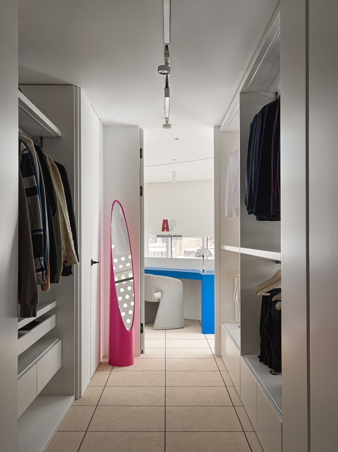 «Единственным пожеланием заказчицы был огромный гардероб – так как заказчица очень яркая и модная девушка. А заказчик очень хотел кабинет в мастер-зоне, который мы решили, как транзитное пространство между спальней и гардеробом», - отмечает дизайнер.