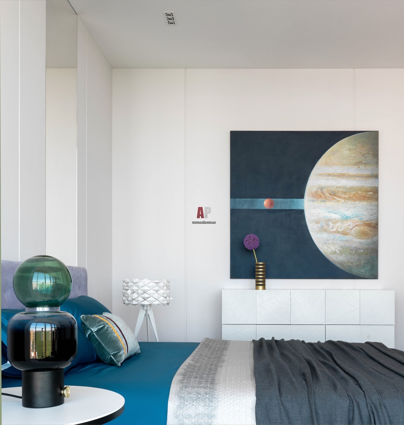 Интерьер спальни в современном пентхаусе. Кровать, Poliform. Столики у кровати, B&B Italia. Картина «Планеты» – художник Дмитрий Котляров.