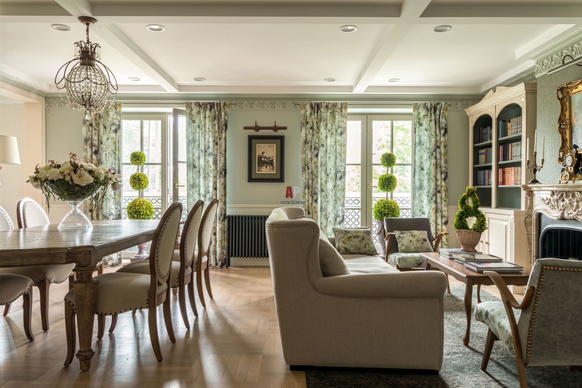 Квартира в средиземноморском стиле на крыше московского дома. Интерьер гостиной. Стол, стулья, консоль, Hooker. Диван и кресла, Gramercy Home. Буфеты, на заказ. Торшеры, Gramercy Home. Лампы, LeHome.