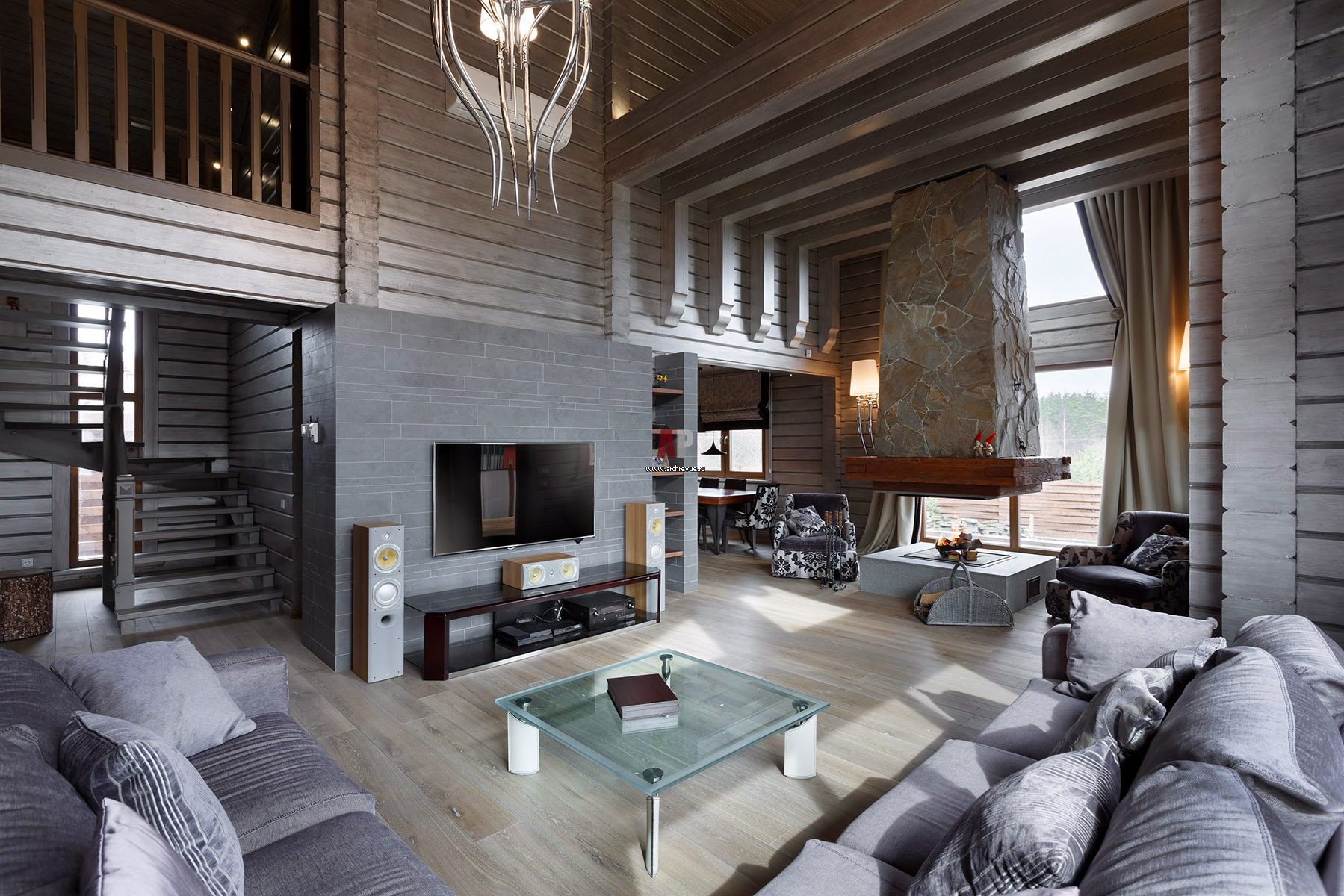 В интерьере деревянного шале традиционные деревянные конструкции сочетаются с современными материалами: плиткой из сланца и диким камнем в отделке дымохода камина. Одной из сложных задач стал поиск нужного оттенка серой краски для стен. Он должен был напоминать состарившееся от времени дерево и при этом не выглядеть мрачно и чрезмерно брутально.