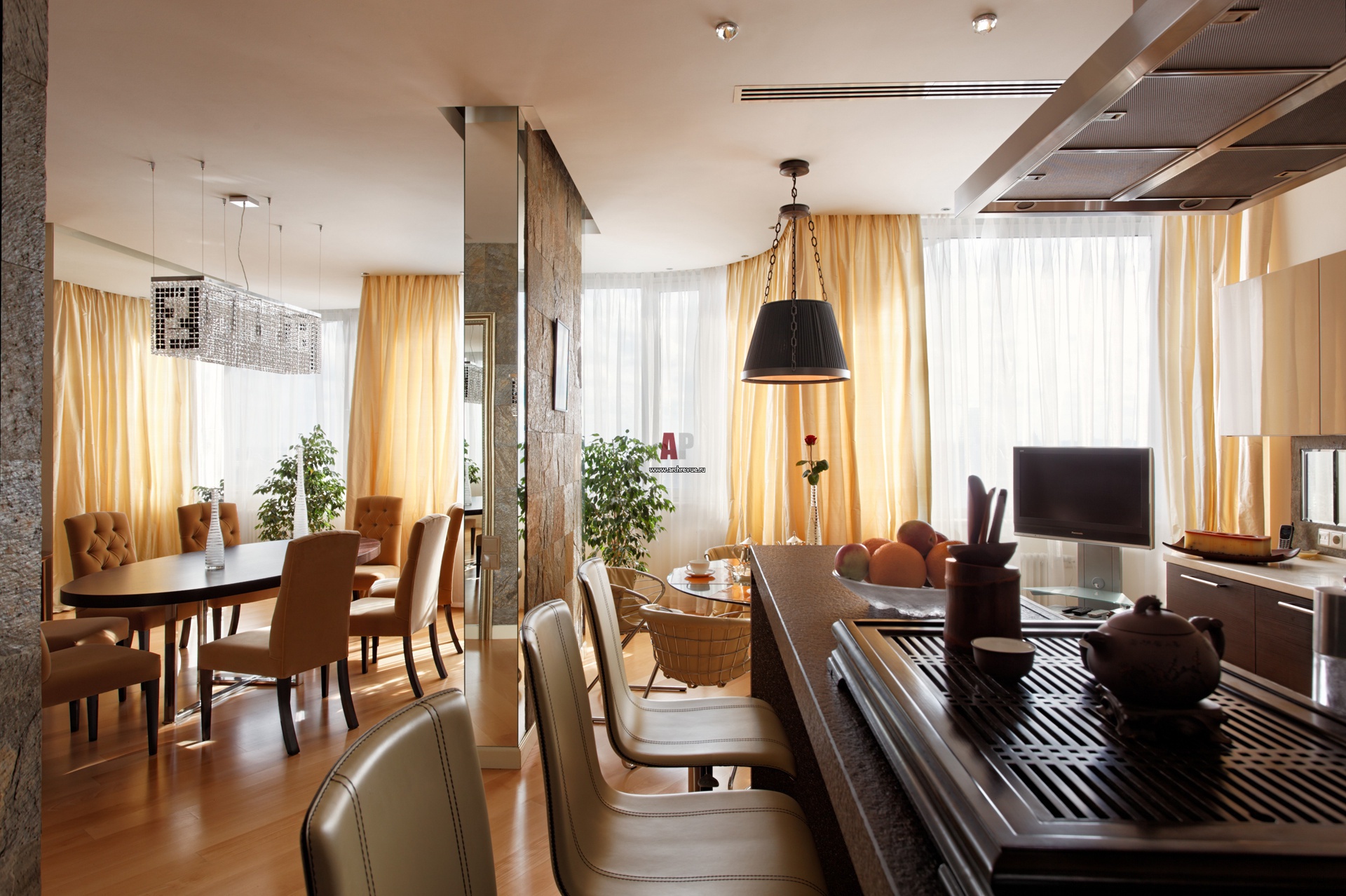 Фото интерьера кухни трехуровневого пентхауса в современном стиле