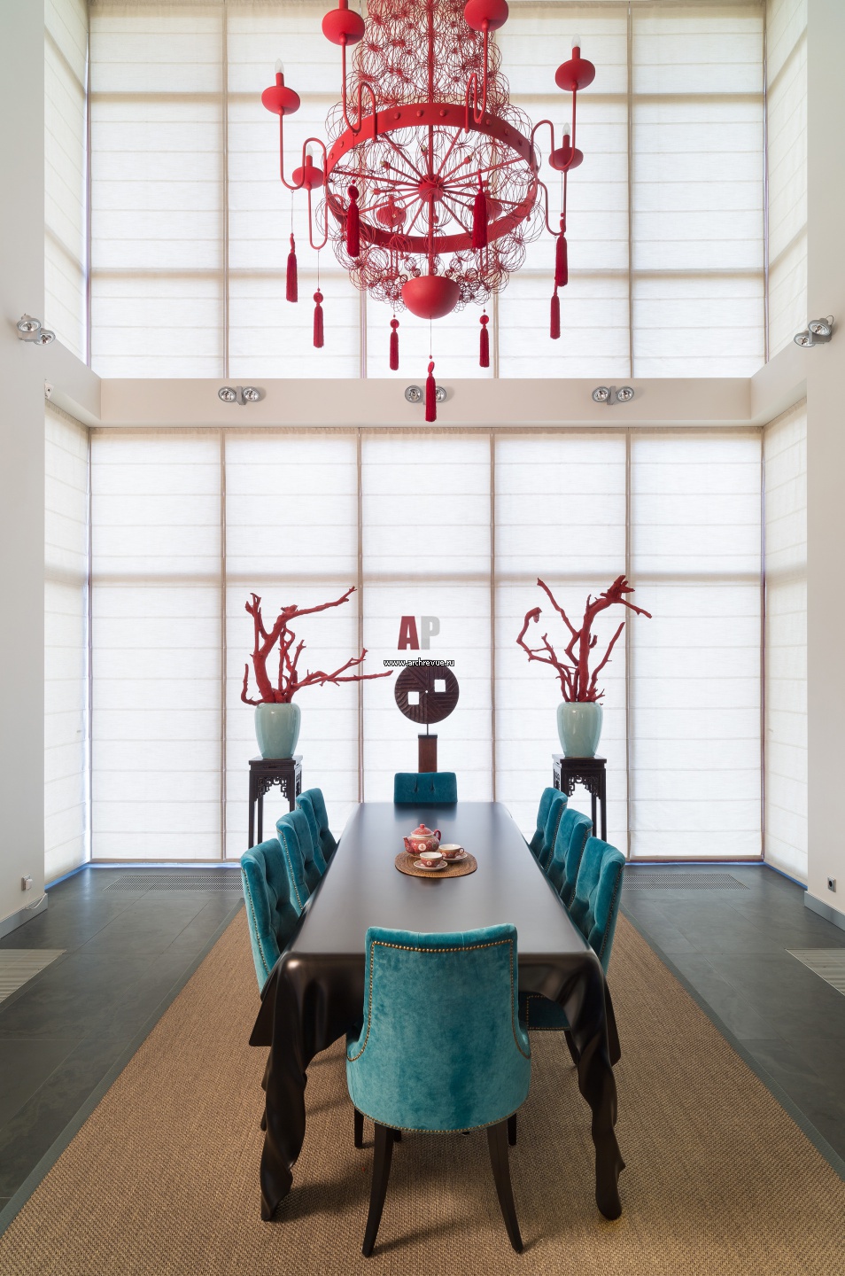 Парадная двусветная столовая. Центральная люстра с проволочным каркасом и кистями сделана на заказ по эскизам Марии Ватолиной российскими мастерами. Стол, стулья, Marioni (модель Kent). Скульптура, Andrew Martin.