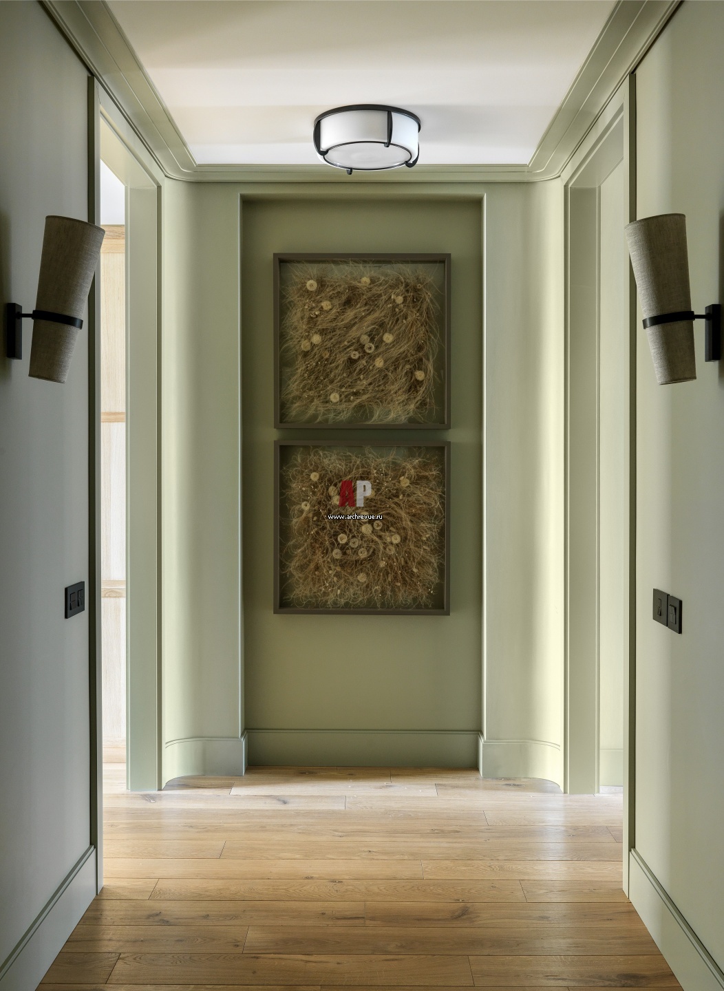 Приватный коридор, он ведет в детский блок и спальню родителей. По главной оси, в конце анфилады расположился диптих из полевых трав и одуванчиков авторства Ларисы Кравченковой. Настенные светильники, Stephane Davidts. Потолочный светильник, Hudson Valley Lighting.