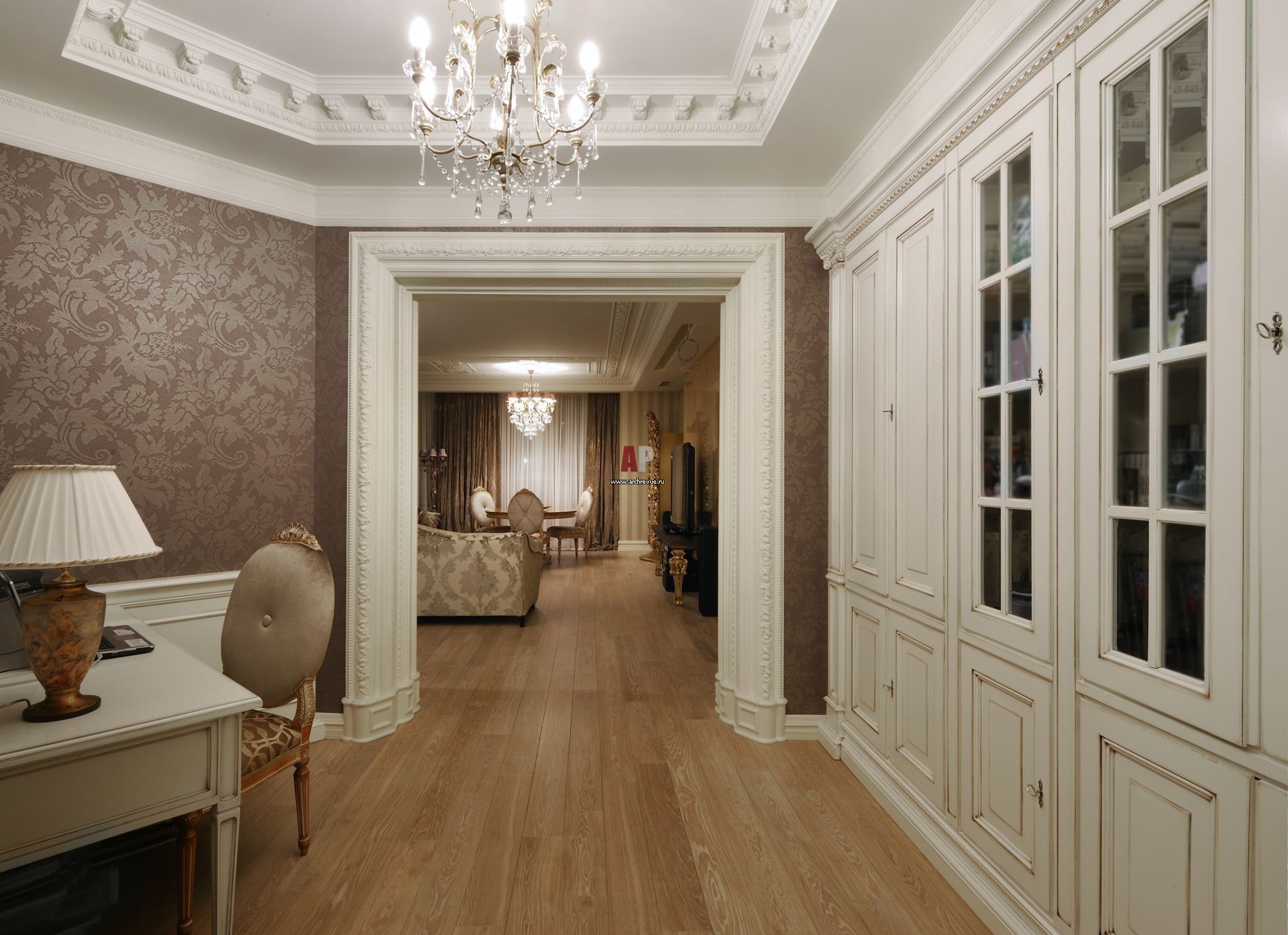 Кабинет предваряет вход в гостиную. Он расположен анфиладе и является проходным. Эта небольшая рабочая зона, где можно уединиться и поработать, сочетает и функции библиотеки. Зон оформлена с помощью светлой мебели и встроенных книжных шкафов. Библиотека Martini Mobili , Luciano Zonta, Spini; поставщик A&D Interiors. Пол - поставщик Siberian Forest