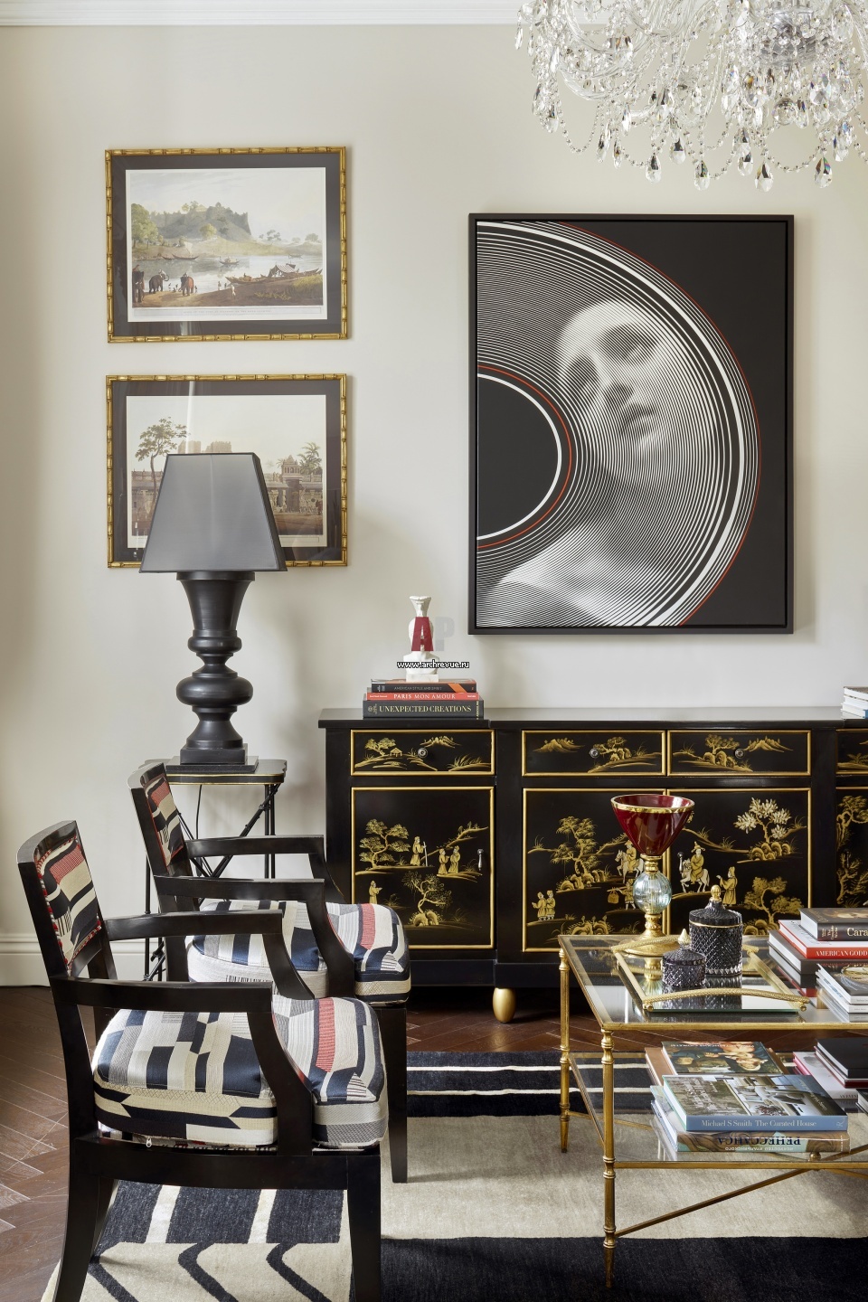 Гостиная. Кресла, JNL в ткани Dedar. Приставной столик, Mis en Demeure. Комод в стиле шинуазри сделан на заказ, черный лак с росписью. Картина Егора Острова.