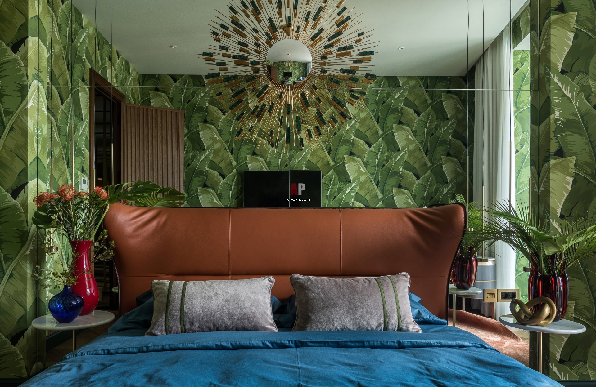 Обои с крупными банановыми листьями придают хозяйской спальне сходство с тропическим островом. Они отражаются в зеркальной стене за кроватью.