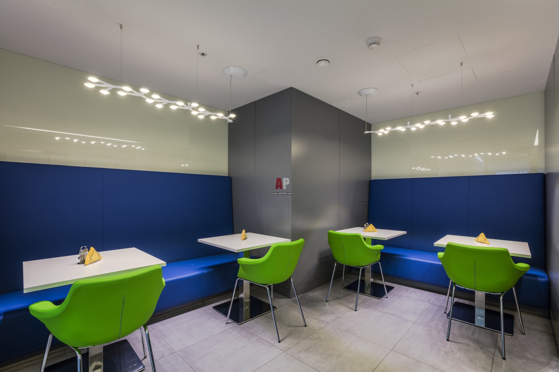 Интерьер столовой выглядит современным за счет синих диванов, зеленых кресел, стеклянным настенных панелей и оригинальных светильников-гирлянд из кораллов.