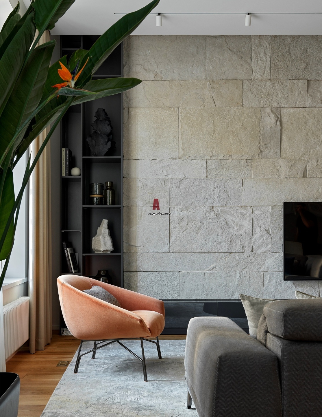 Декоративная домината гостиной – каменная облицовка стены за ТВ. Архитекторы рассматривали варианты из итальянского камня и отечественного гранита, пока не увидели дагестанский песчаник: эффектный, брутальный, легкий в обработке и монтаже.